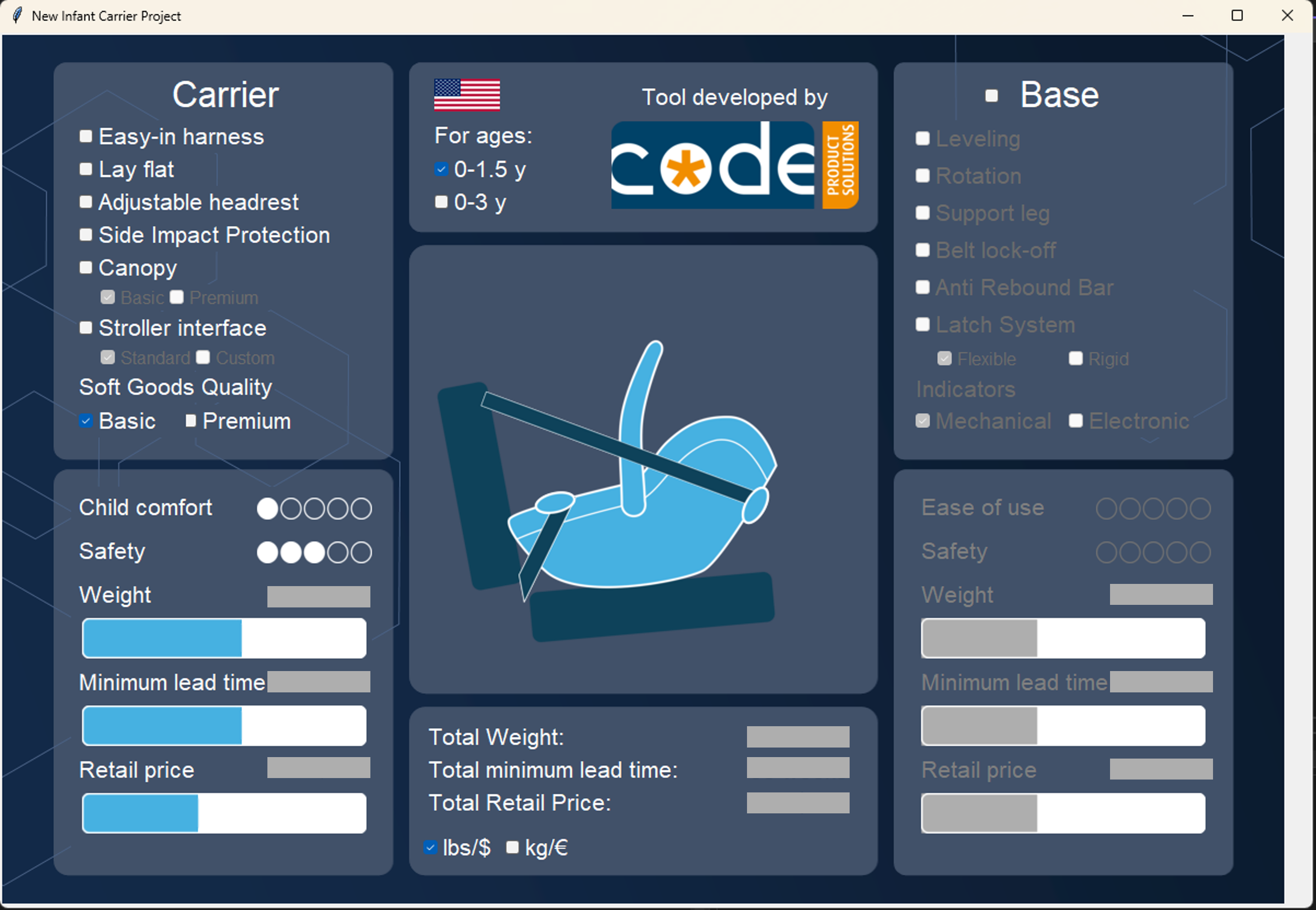 Tool to determine project cost, lead time and retail price of a Child Restraint System for the US market, based on specifically chosen features.